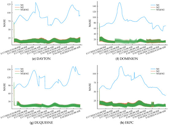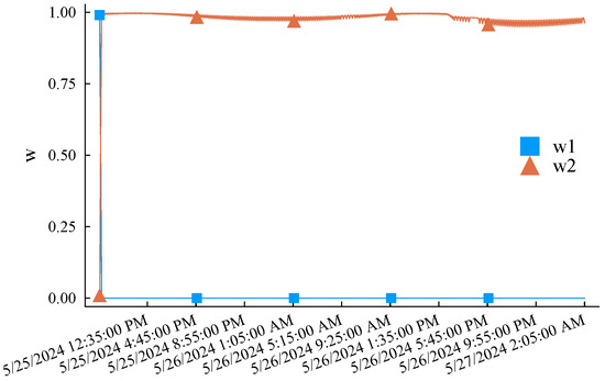 The simulation experiment process is as follows. First, the first of the original low-voltage load curve is selected as the initial training sample. Each experiment uses the latest q samples of the current training pool as the feature sample to predict the load in the subsequent period (a total of 48 prediction points) and compare it with the actual records. After a simulation is completed, the training samples of M1 step forward by one data point, while M2 determines whether it is necessary to update the training sample pool according to the criterion eMASE > 15. M1 and M2 only need to update the weights according to (2). Afterward, the feature sample also steps forward by one data point, and the above simulation experiment process is repeated until the end data of the original load curve are reached. eMASE generated by the three prediction methods during the above complete experimental process is summarized in Figure 7. Taking the prediction error of the M1 as the benchmark reference, it can be clearly observed that the prediction performance of the M2 is much better than the M1 method due to the incremental learning mechanism and dynamically updated training samples. The reason for the significant difference in the prediction error performance between the two methods is that the training samples of the M1 are also dynamic. However, it only intercepts the latest load curve and does not memorize the characteristics of early samples. The M2 also initializes its training sample pool with the load curve but selectively replaces the training samples according to the error threshold, striving to maintain the diversity of limited samples. The M1 and M2 track the error changes in the embedded M1 and M2 through weight optimization. As shown in Figure 8, the methods with smaller historical errors are dynamically given higher weight. The overall error performance is significantly better than M1. The maximum absolute error of single-point prediction is 547.51 W. The last thing to note is that the M1 and M2 maintain the same amount of samples, which is doubled for the proposed method. In this example, , and the memory usage is trivial.