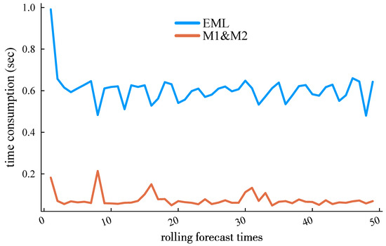 It is worth noting that Figure 10 reports the total time consumption starting from the initial training sample. The time consumption decreases as the forecasting process progresses, transitioning from the initial model training phase to lighter incremental learning.