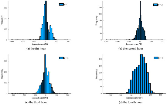 Firstly, to understand a proper model definition of , we arbitrarily select the “DAYTON” load curve () for illustration. The distributions of hourly peak load forecast errors via the M1 and M2, for each sequential 4 hours to the fault time, are plotted in Figure 12. It can be noted that the tails of the error distributions widen with an increasing lead time, and the distribution pattern varies unpredictably. In this regard, the empirical distributions seem to be more rational to govern the forecast error randomness than kinds of parametric distribution functions.