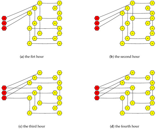 The above nine load curves are assumed to correspond to ∼ in Figure 5. This topology contains a total of 32,767 potential loops. It is assumed that the short-circuit fault time is 9:55 p.m. on 26 May 2024, which occurs between the distribution box and “light power cabinet I”. Peak loads of the system for each hour following the fault are 60,598 W, 62,128 W, 64,135 W, and 66,181 W, respectively. All the backup switches situated at the sending ends of the single-phase lines remain open readily before the LVPSA self-healing strategy responds to the fault.
