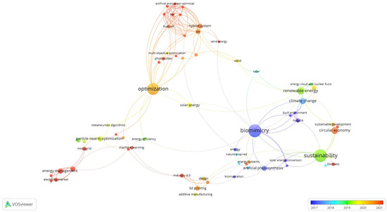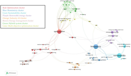 There are a total of eight clusters on the map; the size of each circle is an indication to how relevant each key word is in the literature: “optimization” (red), “biomimicry” (blue), and “sustainability” (cyan). The biomimicry cluster is tightly linked to renewable energy concepts like “renewable energy systems”, “artificial photosynthesis”, and “solar energy conversion”. Sustainability, in turn, connects closely to both biomimicry and concepts like “circular economy”, “sustainable development”, and “biomass”. Notably, the optimization cluster, while distinct, associates with terms such as “machine learning”, “energy efficiency”, “energy management”, “industry 4.0”, and “hybrid systems”. Solar and wind energy appear as relevant topics across all three clusters.