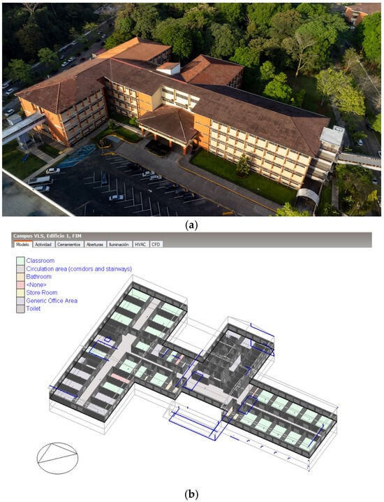 (a) Building n°1 of the Víctor Levi Sasso Campus of the UTP and (b) section showing one of the floors of the building n°1 3D model in DesignBuilder.
