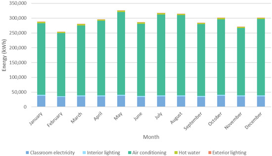 Energy simulations were performed in DesignBuilder, using EnergyPlus. The model, which incorporated actual building divisions, provided detailed data on the building’s energy needs. These simulations considered key parameters such as student occupancy, building materials, and energy use patterns. A section showing one of the floors of the building model is shown in Figure 4b. Figure 5 shows the energy building’s energy demand by category.