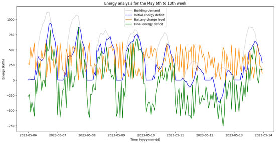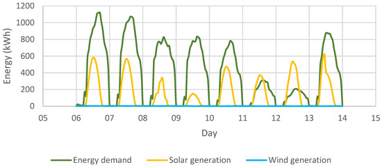 Analysis of the large dataset gathered from the previously described methods reveals several key insights. Combined solar and wind generation meet 33% of the building’s energy demand, while air conditioning dominates consumption at 85% of the total load. Most importantly, the analysis yields numerous figures, the most comprehensive of which is visualized in Figure 6, which shows the data from May 6th to 13th.