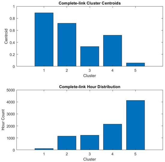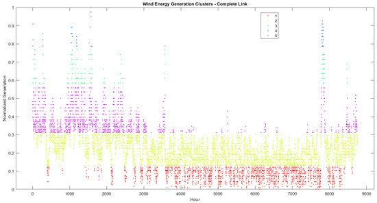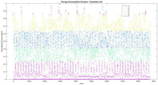 To understand overall system patterns in energy consumption and generation, a comprehensive analysis was performed using a Python script. This analysis encompassed all three system components (consumption, solar generation, and wind generation), although the figures presented here focus primarily on generation. Dendrograms were created using single, complete, and average linkage methods to explore the data clustering. Following Mora et al. [33], the complete-link method was selected. Figure 7 shows all three dendrograms generated for energy consumption.