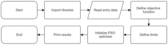 The most important aspect of every optimization problem is the objective function; here, we consider two. Where E is energy, D is deficit, A is area available, and G is generation, Equations (1) and (2) represent the total energy generated by both the solar and wind parts of the system, respectively. This considers the area in square meters that each part occupies on the roof, and the generation per unit of area. This takes us to Equation (3), where the results from the two previous equations are used to calculate the energy deficit, by subtracting them from the energy demand of the building, and lastly Equation (4) is the objective function, which is the sum of the deficit in the given time of the project, the result of which must be minimized by the algorithm. Not shown in these equations are the limits enforced on these variables, which limit things such as the area of the roof that is available (0–3802.12 m2), an upper and lower limit for working wind speed for the turbines (5–14 m/s), a penalty given to the algorithm which forces it to remain within the previously defined area bound, the PSO variables were set at 100 particles and 1000 iterations of the optimization. An explanation for the work process of the written snippet in Python that performs this task is available in Appendix A, but a flowchart showing the basic steps is shown in Figure 11. The end result is that the algorithm indicates how much, in percentage, of the available space on the roof corresponds to the solar panels and wind turbines, respectively. These percentages are then converted to an actual number of solar panels and turbines.