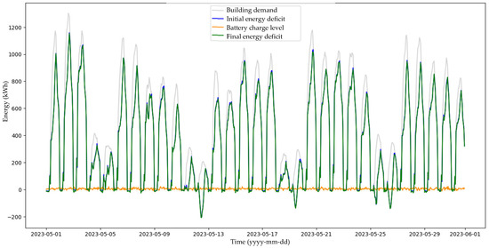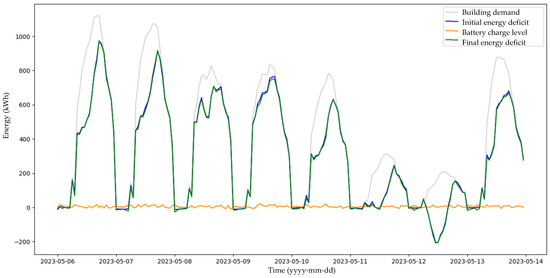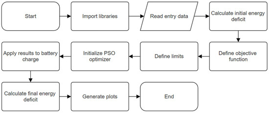 The second stage of optimization focused on battery discharge management. It used data from the first optimization with the same PSO parameters, where variables with the same name depict the same information, but it could also incorporate data from other sources, such as DesignBuilder energy simulation results. Equation (5) calculates the energy deficit considering the battery discharge, and Equation (6) is the objective function. Similar to the first optimization, the Python code snippet explanation for this task is available in Appendix A and a flowchart showing the basic steps of the process is shown in Figure 12. The limits placed on these equations include the lower and upper bounds for battery capacity.