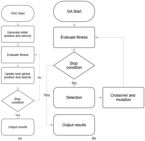 This simulation explicitly modeled and enforced battery constraints, namely the previously mentioned battery bank capacity and a 0.9 charging efficiency. GA parameters were chosen based on typical ranges and preliminary testing to ensure robust performance: a population size of 100, consistent with PSO for fair comparison and providing sufficient diversity for the high-dimensional problem, was evolved over 50 generations, found to be adequate for convergence in initial runs. Two-point crossover (probability 0.5) was selected to allow effective exchange of scheduling blocks, while Gaussian mutation (probability 0.2, sigma = 10, indpb = 0.1) provided necessary local search capability for the continuous nature of discharge values. Tournament selection (size 3) was used for its common effectiveness in maintaining selection pressure while preventing premature convergence. Figure 13a,b demonstrate an overview of how PSO and GA work at a basic level.