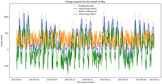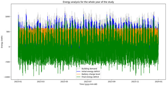 - Year-Round Plot: Plot energy consumption, initial deficit, battery discharge, and final deficit across all dates. Add a title and legend.