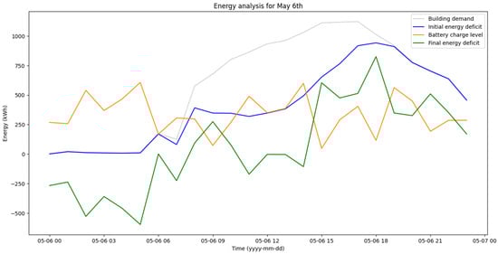 We performed optimization in two areas: first, optimizing the distribution of the generators on the roof of the building, and second, optimizing the battery discharge rate. The first optimization determined the optimal mix of the pre-established number of generators. The second optimization used the algorithm to determine the best moments during the day to utilize stored battery energy, given inputs of generation, consumption, and other relevant data. This aimed to reduce the energy deficit compared to the original system.