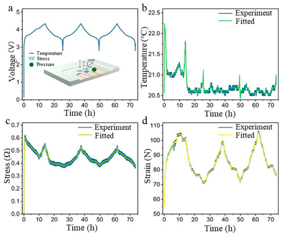 The electrochemical performance and corresponding thermal and mechanical features of sample cell at formation cycles. (a) Voltage profile and schematic illustration of cell holders with temperature, strain, and stress sensor. The experiment and fitted (b) temperature, (c) stress, and (d) strain profiles.