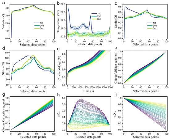 Features extracted from the formation and cycling processes, using battery 20–72 N as a representative sample. During the formation process, the extracted features include: (a) voltage curve, (b) average temperature curve of three points, (c) strain curve, and (d) pressure curve. (e) Charging voltage curve during the cycling process, along with four corresponding features across the 3.70 V to 3.85 V range: (f) partial charge voltage curve, (g) partial charge capacity curve, (h) difference in charging voltage curve (∆Vi−1) between each cycle and the first cycle, and (i) difference in charging capacity curve (∆Qi−1) between each cycle and the first cycle.