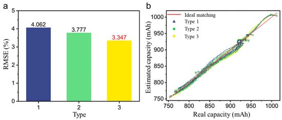 CNN estimation on capacities. (a) Average RMSE for the three input types and (b) visualization of the predicted values versus the actual capacities.