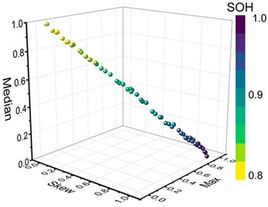 The relationship between the maximum value of the cyclic charge capacity curve and capacity degradation shown in Figure 6 reveals significant correlations between key statistical parameters of the cyclic charging profile and battery capacity degradation. Specifically, the maximum value of the cyclic charge capacity curve demonstrates an inverse relationship with capacity fade—as the cycle count accumulates, the attainable charge capacity within the fixed voltage window progressively diminishes. The median is the middle value of the sampled voltage. As the number of cycles increases, it shows that an increasing number of sampled voltage data points are above the average voltage (mean). The statistical skewness coefficient (γ₁), quantifying the asymmetric distribution of voltage plateaus during discharge, exhibits a right-skewed profile (γ₁ > 0) that progressively diminishes with cycling, correlating with the homogenization of Li-ion flux distribution caused by electrode porosity evolution. This corresponds to the shape of the cyclic charge curve, where initially, the voltage increases slowly, then gradually speeds up as the charging time progresses.