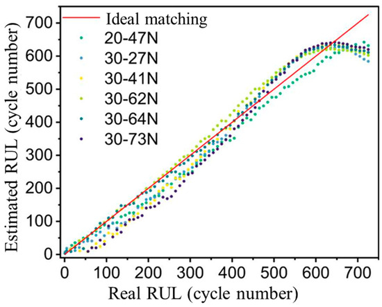 The RUL estimation results presented in Figure 8 demonstrate a characteristic evolution pattern of prediction accuracy throughout the battery aging process. While the predicted RUL values generally follow the actual degradation trajectory, the prediction performance exhibits temporal dependency. Specifically, the data-driven model shows greater deviations during initial degradation phases, with prediction errors gradually diminishing as cycling progresses. This phenomenon can be attributed to the adaptive learning mechanism of model that continuously incorporates real-time degradation patterns through online updating algorithms. Notably, the prediction reliability significantly improves during the latter lifespan (corresponding to accelerated degradation phases), achieving sufficient accuracy for practical decision-making applications. Statistical analysis reveals an average RMSE of 38 cycles for conventional RUL predictions, which is substantially reduced to 16 cycles through our optimized estimation framework (detailed parameters in Table 2). This temporal accuracy progression carries critical practical implications. During early degradation stages when failure mechanisms remain stochastic, the conservative prediction intervals provide sufficient safety margins. As batteries approach their end-of-life threshold (typically 80% capacity retention), the enhanced prediction accuracy (RMSE < 20 cycles) enables three key operational strategies: (1) development of optimized charge–discharge protocols to extend residual lifespan through degradation-aware management; (2) predictive maintenance scheduling for critical battery pack components; and (3) risk-informed replacement planning to prevent thermal runaway incidents. Particularly for electric vehicle applications, this phased accuracy characteristic aligns well with real-world usage patterns—early warnings facilitate long-term battery health planning, while precise RUL predictions enable safe retirement management.