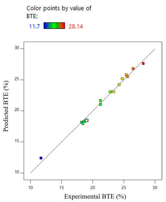 - The predicted results were compared with the experimental data. It revealed a significant correlation between the experimental findings and the model results. Coefficient of variance (R2) values are close to 1, suggesting that the independent variables are highly correlated.