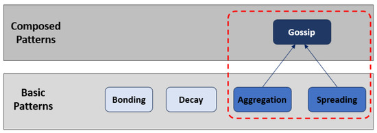 Gossip pattern: combination of aggregation and spreading patterns (in the red dotted box), inspired from bio-inspired design patterns [36]. The bottom layer, called basic patterns, contains the four elementary patterns currently implemented in the current version of the SAPERE derived middleware, in the form of coordination mechanisms.