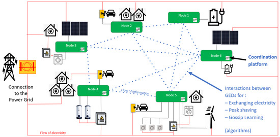 A node (also called GED: grid edge device) is a local computing device of the environment, identified by a network address and linked to a set of direct neighbouring nodes, as well as to a set of local electrical devices with which it interacts. In the context of this paper, a node is associated with a building and is also called a GED (grid edge device).