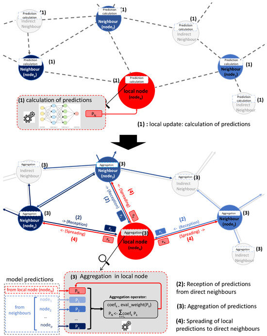 Decentralised knowledge sharing between different nodes in a network can be achieved in different ways, depending on whether the learning models have the same structure or not. Either the different entities manage learning models with the same structure, in which case it is possible to exchange model weight parameters to make each node’s model “more efficient” in predicting electrical behaviour at a local level or cluster level. In this case, we can try to adopt a federated learning strategy based on the gossip mechanism. Alternatively, the entities have heterogeneous structural models, and exchanging model parameters makes no sense. In this case, it is possible to benefit from the learning experience of other nodes by exchanging the prediction data generated by the different nodes. It is always possible to aggregate prediction results, whatever the learning model used by the nodes. In this situation, we can adopt an ensemble learning strategy, based on a gossip mechanism. In both cases, we are talking about decentralised learning using the gossip mechanism, but in the first case, we are talking about federated learning and applying aggregation to learning models, while in the second case, we are talking about ensemble learning and applying aggregation to the predictions themselves.