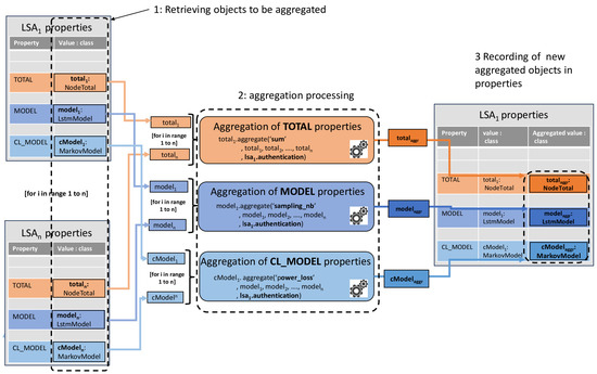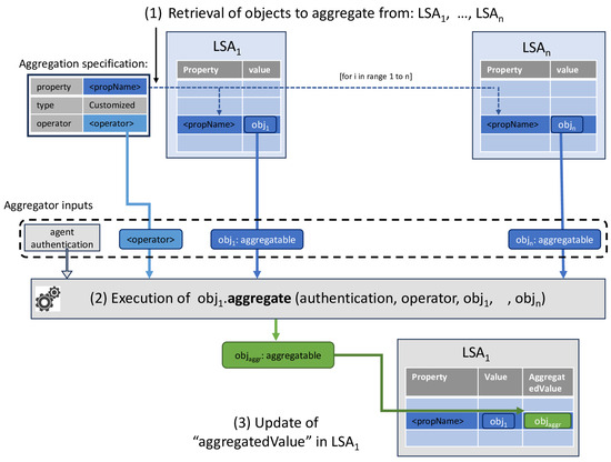 We now describe how the gossip mechanism gradually achieved consensus. Let us consider a specific piece of information on which a cluster of nodes applies gossip. At start-up, each node contains a different value of the same information, but at each gossip application cycle, this same information is broadcast to neighbouring nodes, and each node applies an aggregation operator receiving as input its own value as well as that received from its neighbours. A received value may already have been aggregated previously by indirect neighbours. Regardless of the operator used, in each node, the aggregation will end up directly or indirectly integrating the version of all the other nodes. As a result, the gossip makes it possible to arrive progressively at a convergent result, which corresponds to a consensus. The speed of convergence and the obtained consensus value can vary depending on the operator used (for example, min or max or average or other type of operator). In some cases, convergence is delayed if a node modifies its local version before the information has had time to converge. Indeed, in this context of dynamic adaptation, the digital twins attached to the nodes regularly modify their properties and, as a result, new values regularly arrive in each aggregator. Section 2.5.1 and Section 2.5.2 describe the implementation of these two elementary mechanisms within the SAPERE derived middleware.