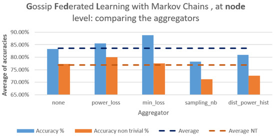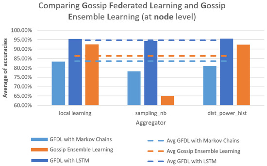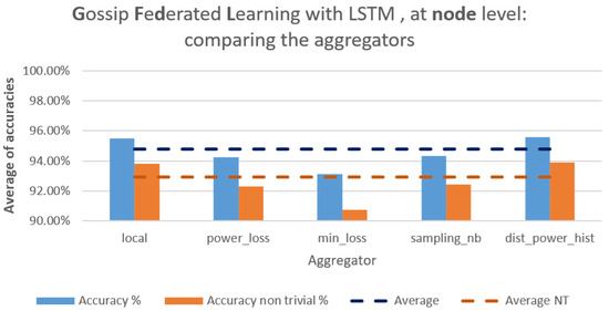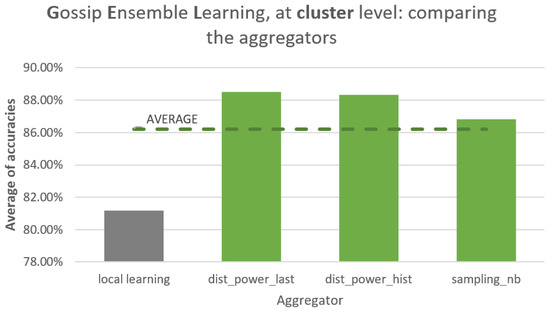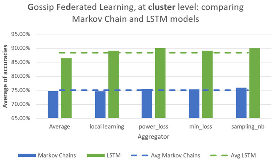 First, we observed a significant difference in accuracy between the Markov chains and LSTM classifiers, independent of the use of the gossip mechanism. Figure 12 shows this very clearly. However, this very significant accuracy gain brought by LSTM is not free, in the sense that LSTM consumes much more memory and computing time and requires more effort in terms of integration to be able to be called by the digital learning twins running in the coordination platform (see Table A1). On the other hand, one might think that the gossip ensemble learning approach could alleviate the poor performance of Markov chains by mixing predictions, but the same experiment without any LSTM node gives worse results. Since we can adjust the re-learning and gossip frequency, we can limit the resource over-consumption by LSTM: as a result, the use of LSTM remains largely beneficial. In other respects, these results show that the relative performance of an aggregator fluctuates greatly depending on the learning model used, the model hyper-parameters, the prediction perimeter and other parameters linked to the experiment context. This confirms the need to carefully test and compare the impact of each aggregator on accuracy when implementing a new model or modifying the perimeter or certain hyper-parameters. Depending on the situation and the model used, gossip does not bring systematic gains, but the choice of an appropriate aggregator is decisive in improving accuracy. For example, changing the learning model or extending the prediction perimeter to the entire cluster rather than just the local node tends to upset the relative performance of each aggregator. In all the test cases, at least one of the aggregators implemented outperformed local learning, and depending on the situation, the benefits of the most appropriate aggregator may be considerable. In more general terms, we have observed that the gain from gossip is more systemic when the nodes are trying to predict similar behaviour (i.e., behaviour at cluster level in the context of this study). This confirms the added value of the gossip mechanism in such a case. Furthermore, the relative gains linked to gossip are greater overall for LSTM than for Markov chains: the gossip mechanism barely compensates for the difficulties encountered by the Markov chains model and further accentuates the relative performance of LSTM. Choosing the right model and the right aggregator is therefore doubly beneficial. The gossip ensemble learning variant that we have implemented is an equally interesting alternative; it provides comparable (or almost comparable) accuracy, although it has far fewer integration constraints. Similarly, the gains associated with gossip depend on the similarities between behaviours and may be greater when the basic learning model tends to be more accurate without using gossip.