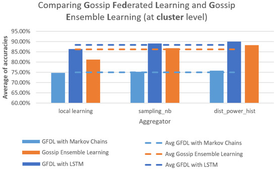 According to Liu et al. [16], this approach reduces the communication traffic among nodes and prevents disclosing sensitive local data to other nodes. During the inter-node communication phase, one node only sends the computed weights of its learning model (and not training data). An empirical study, ref. [17], provides a systematic comparison of federated learning and gossip federated learning approaches, using experimental scenarios including a real unsubscribe trace collected on cell phones under different conditions: communication regularity (continuous or in bursts), bandwidth, network size, and compression techniques. Another approach has experimented with gossip federated learning on an ultra-dynamic configuration, such as a network of electric vehicles moving in an urban environment [18]. To predict the vehicles’ trajectories, this experiment has applied gossip federated learning to a fleet of moving cars, with each vehicle device locally executing the LSTM learning model. The results confirmed that in this type of highly dynamic configuration, gossip federated learning significantly improves the accuracy of poor-experienced vehicles, by taking advantage of the learning experience of better-trained models that move in the vicinity. As the decentralised federated learning approach is new, there are still very few applications in the field of energy.