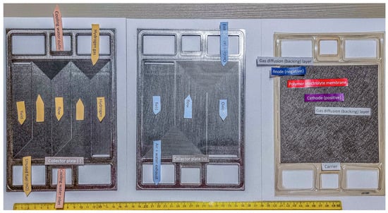 These improvements in sustainable mobility represent a critical step in slowing emissions growth as society moves towards low-carbon energy sources. Figure 1 illustrates the components of a disassembled PEMFC, displaying gas flow channels for hydrogen and oxygen (in carbon-based bipolar plates) as well as the membrane electrode assembly (MEA). Despite their numerous advantages, the limited lifespan of PEMFCs still hinders their commercialisation. Over prolonged operation periods, PEMFC performance gradually deteriorates due to intricate operational conditions and component ageing, eventually reaching the minimum acceptable threshold []. Below is a description focused on the function of the individual parts and relevant degradation mechanisms [,,,,,].