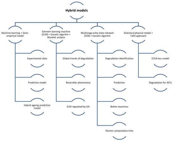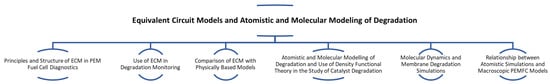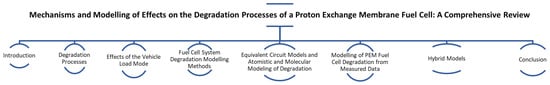 The article is structured into seven main sections. Section 1 introduces the topic of the review article and describes the innovation, the authors’ goal, and their motivation. Section 2 provides an overview of the main degradation mechanisms that affect the performance and lifetime of the proton exchange membrane. It focuses on how various physical and chemical influences contribute to the degradation of individual components, including the membrane, catalyst layer, diffusion layers, and bipolar plates. The chapter discusses mechanical degradation (e.g., forming cracks and perforations in membranes) and chemical processes, such as oxidation and corrosion, that degrade fuel cell performance. Section 3 examines how different operating conditions and vehicle load regimes affect fuel cell degradation. It focuses on other modes, such as start/stop cycles, dynamic loading, idling, and high load. It describes how each of these modes contributes explicitly to the degradation of cell components. For example, start/stop cycling causes carbon corrosion, which reduces the active surface area of the catalyst, while high load increases chemical corrosion of the membrane. Thus, the chapter analyses how different driving modes accelerate degradation and reduce fuel cell lifetime. Section 4 focuses on different approaches for predicting fuel cell degradation. It describes three main types of models: physics-based, data-driven, and hybrid. Physics-based models offer detailed and accurate simulations based on fundamental physical laws, but their drawback is their high computational complexity. Data-driven models work with historical data and are computationally less demanding but cannot generalise to new conditions. Hybrid models combine both approaches, attempting to balance accuracy and computational efficiency. The chapter evaluates the advantages and disadvantages of each model and their use in predictive maintenance, which can potentially extend the life of fuel cells in the challenging conditions of automotive applications. Section 5 introduces equivalent circuit models (ECM) to simplify the electrochemical behaviour of PEM fuel cells, enabling real-time diagnostics and monitoring of degradation. Changes in ECM parameters, such as increased resistance or decreased capacitance, indicate membrane drying, catalyst degradation, or contamination, which can be tracked using electrochemical impedance spectroscopy (EIS). While ECMs offer computational efficiency, physically based models provide a more detailed but complex description of fuel cell processes. Atomistic and molecular modelling, including density functional theory (DFT) and molecular dynamics (MD), helps understand catalyst dissolution, membrane degradation, and impurity effects at a microscopic level. Integrating ECM with atomistic simulations and machine learning improves degradation prediction and material optimisation for enhanced fuel cell longevity. Multiscale modelling efforts bridge the gap between atomistic insights and real-world fuel cell performance, ensuring more accurate lifetime predictions. Section 6 focuses on approaches to modelling degradation using empirically collected data. This chapter describes how historical and experimental data can help predict fuel cell degradation and performance without complex physical models. Data-driven models enable fast and efficient predictions, although they require large amounts of data for accurate results. The chapter also focuses on the various data processing techniques and algorithms used for fuel cell lifetime analysis and prediction, contributing to more effective use of these systems in real-world applications. Section 7 combines physical and data-driven approaches for modelling fuel cell degradation. Hybrid models seek to combine the advantages of physical models, which provide accurate simulations based on fundamental principles, and data-driven models, which are less computationally intensive and allow fast predictions. This chapter details how hybrid models use physical equations for the main degradation mechanisms while data-driven algorithms handle complex and challenging conditions. Hybrid models aim to increase the accuracy and efficiency of predictive fuel cell maintenance and deploy them in real-world applications where high reliability and system performance are expected. Section 8 summarises the main findings on the degradation mechanisms of PEMFCs and their modelling capabilities. The chapter emphasises that a detailed understanding of degradation processes is essential for extending the lifetime of fuel cells, which is particularly crucial for their deployment in the automotive industry. For better illustration, the main sections of the article are illustrated in Figure 2.