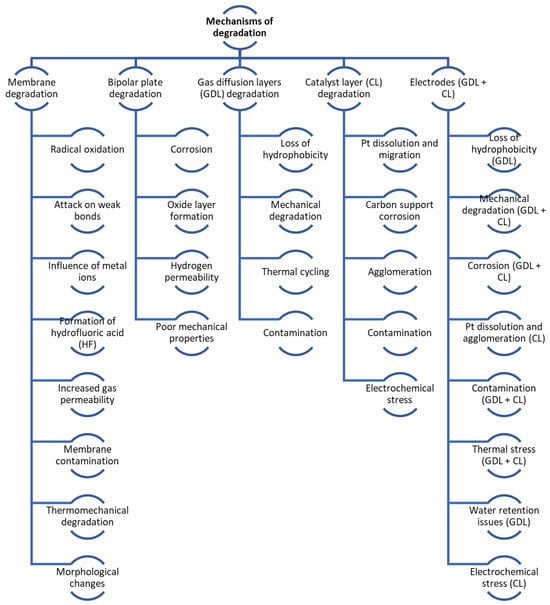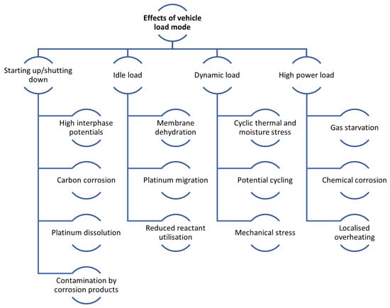 During actual vehicle operation, the FC often works under variable load conditions, including startup/shutdown, dynamic load, idling load, and high power load. In an FC life assessment study, each load condition has a large impact on life due to various DMs. Figure 5 provides a comprehensive classification of the mechanisms contributing to fuel cell performance decline []. Table 3 show degradation effects due to vehicle loading regime.