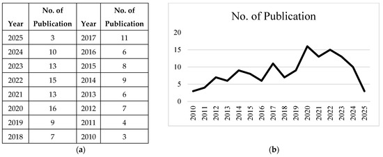 Identified publications by year: (a) Number of publications between 2010 and 2025; (b) Trend in the number of publications between 2010 and 2025.