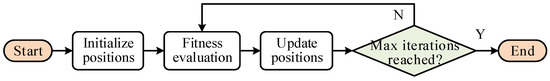 In the initialization phase of the SSA, the number of sparrows, denoted as N, is set, and the search space for PV hosting capacity is defined, which includes the minimum and maximum allowable PV capacity. Then, the initial positions of the sparrows are randomly generated to ensure the complete coverage of the search space. This initialization can be performed using the following formula: