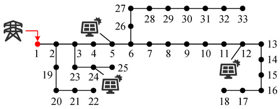 where Pij,t and Qij,t are the active and reactive power flows at time t from node i to node j; and are the active and reactive load power at node j at time t; and and are the active and reactive power outputs of the PV system at node j at time t. The PV system typically only provides active power, and the reactive power can be considered as zero or within a specific adjustable range; Rij and Xij are the resistance and reactance of the line between nodes i and j; Ui,t is the voltage at node i at time t; and Iij,t denotes the current flowing through the line between nodes i and j at time t. Ωj represents the set of all nodes connected to node j. Pjk,t and Qjk,t denote the active and reactive power flows from node j to each adjacent node k at time t, where k belongs to the adjacent node set Ωj.