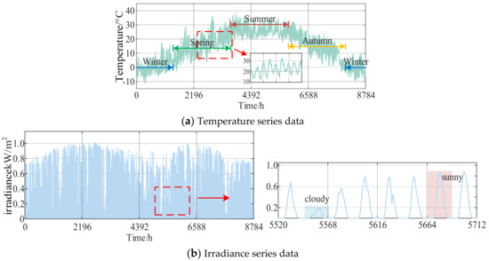 - A joint source–load modeling framework is constructed to enhance adaptability to input uncertainty. This study proposes a joint modelling strategy to overcome the limitations of conventional methods that typically consider only single-sided fluctuations or use static scenario inputs. On the source side, irradiance and temperature are key meteorological variables; on the load side, historical load data are combined with stochastic perturbations to construct representative intraday fluctuation sequences. This dynamic framework more accurately reflects the real operating conditions of distribution networks;