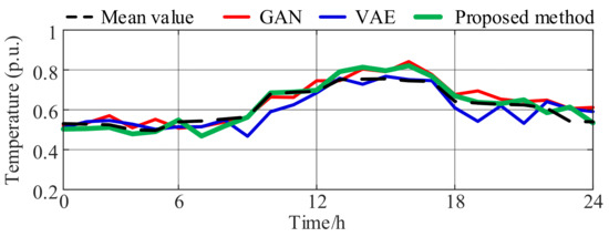 Variations in solar irradiance primarily drive the fluctuation of photovoltaic power, while the temperature impact is relatively minor. Since seasonal temperature differences are primarily reflected in numerical values and the intraday temperature variation pattern remains relatively consistent, this study selects summer temperature samples for normalization and scenario generation. The generation results are shown in Figure 5, and the quantitative evaluation metrics are presented in Table 5.