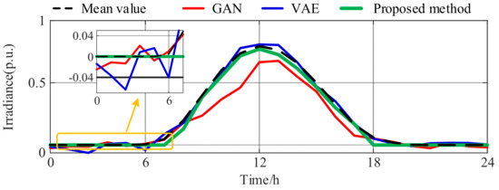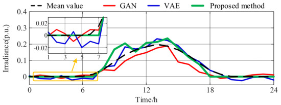 Based on the classified dataset, this paper compares the scenario generation performance of three models: a traditional GAN, VAE, and the proposed WGAN-GP. The results are shown in Figure 6 and Figure 7, and the corresponding quantitative evaluation metrics are presented in Table 6 and Table 7. The irradiance curve presents a distinct midday peak for sunny days, while overcast days exhibit relatively lower irradiance levels and flatter profiles. The generated results from all three methods replicate the general irradiance variation trend well. However, the GAN and VAE generate non-zero values during nighttime, whereas WGAN-GP ensures zero irradiance at night, enhancing the generated data’s physical consistency. Quantitatively, WGAN-GP outperforms the other two models regarding MSE, ACC, and SSIM, indicating a greater accuracy in capturing local details and overall structure.