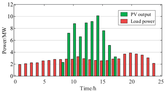 The insufficient PV output scenario reflects situations in which, during high-power-demand periods, the grid cannot meet the demand due to an insufficient PV output, particularly under high-load-demand and low-irradiance conditions. The maximum irradiance for a single day is taken as the target feature, with the target feature selection range set to the low range, guiding the model to emphasize learning in this range and generate scenarios with overall low irradiance levels. Through a hosting capacity assessment for this scenario, the maximum total PV integration capacity is determined as 43.065 MW. Figure 8 shows the daily load power and PV output under this integration capacity and the generated scenario. As seen in the figure, under insufficient-PV-output conditions, when the output is inadequate, the demand for PV integration capacity increases. By increasing the integration capacity, the grid’s demand can be met, thereby avoiding the issue of insufficient system load.