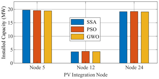 Table 9 presents the total optimal PV integration capacity obtained by each algorithm under this scenario, while Figure 10 illustrates the distribution of PV capacity across node 5, node 12, and node 24. Regarding objective values, all three algorithms achieved comparable results, confirming the solvability and robustness of the proposed evaluation model regardless of the optimization method used. Regarding computational efficiency, the SSA achieved the target solution with fewer average iterations, indicating faster convergence and better search adaptability. This feature is particularly advantageous in multi-scenario evaluations involving complex constraints.