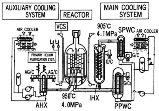 The MCS consists of the helium-helium heat exchanger IHX and two pressurized water coolers (PPWC and SPWC). The ACS consists of an auxiliary heat exchanger (AHX), two auxiliary helium circulators, and an air cooler. In the event of an accident, forced core cooling must be available, and the ACS automatically starts in response to a reactor SCRAM signal. Two vessel cooling systems (VCS) for the reactor pressure vessel (RPV) are provided to prevent the reactor core and pressure vessel from suffering thermal damage when the ACS is unable to cool the core. The VCS is designed as an independent system, disconnected from other cooling systems with its own emergency power supply; it is also in service during normal operation to cool the concrete walls. The VCS functions as a residual heat removal system when forced circulation in a primary cooling system is no longer available due to a rupture in its piping system.
