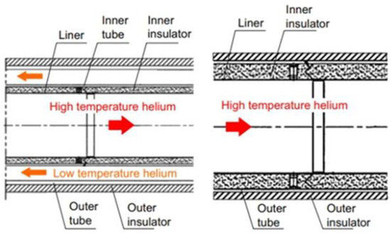 In the IHX exchanger, the primary helium is moved by a blower and interacts with the secondary helium, which will then be used by the steam reformer instead of interacting with the pressurized water coolers, as shown in Figure 2. The secondary helium enters from the top and is uniformly distributed through an annular duct, exiting in a counterflow direction.