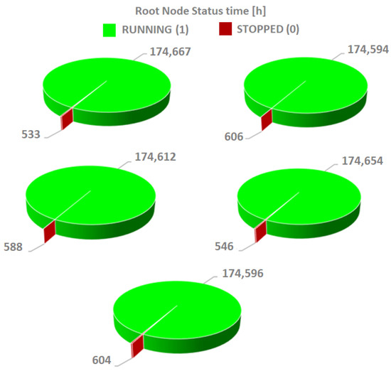 Uptime and downtime of the hydrogen production plant (status of the HP—hydrogen production—node in the operational tree) for the five simulations.