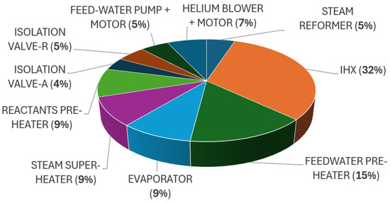 From Figure 8, the results clearly indicate that the most critical sub-assembly is the intermediate heat exchanger (IHX), whose failures are responsible for 32% of the total plant stops. With regards to the other assemblies, the failure breakdown shows that the malfunction percentage because of heat exchangers settles between 9% and 15%, while flow control and pumping components stay in the range of 5–7%. The steam reformer contributes to 5% of total failures.