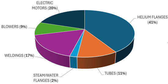 Figure 9 shows the distribution, in percentage, of the failures manifested by all the plant elementary components. As visible, most of the failures are caused by flanges in the helium circuit, electric motors, weldings, and tubes, with respectively 41%, 20%, 17%, and 11% of total failures.