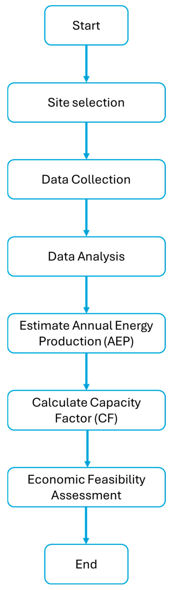 WRA aims to estimate the amount of energy that can be generated by a wind power plant or a WF over a given lifetime of the WT [31]. This activity includes the process of measurement and analysis of meteorological and wind speed data at a specific location [32]. To determine the economic feasibility of a wind project, the AEP is the most important quantity to be estimated in addition to the CF. In this study, a comprehensive WRA approach is proposed as shown in Figure 1. It starts with the selection of the right potential site and ends with the estimation of the AEP and plant CF.
