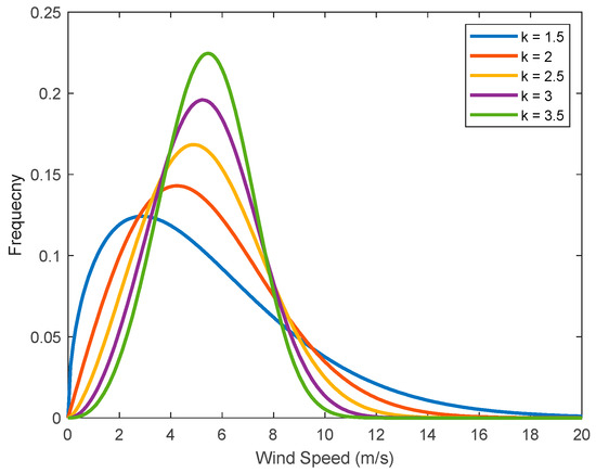 As reported in [36], the unitless parameter is often around 2. This value can be used as a good starting point for the iterative process to determine a more accurate value of . In fact, the Rayleigh distribution given by Equation (1) is a special case of the Weibull distribution, with . Furthermore, Figure 2 shows an illustration of the effect of the shape parameter on the Weibull distribution with scale parameter . It is worth mentioning that a higher value of indicates a more consistent wind speed, with most data points clustering around the mean. Conversely, a lower value of indicates greater variability in wind speed.