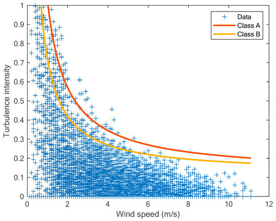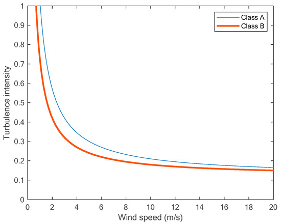 Using the values given in IEC 61400-1 [42] for class A and class B wind turbines, we can plot the turbulence intensity , as shown in Figure 3.
