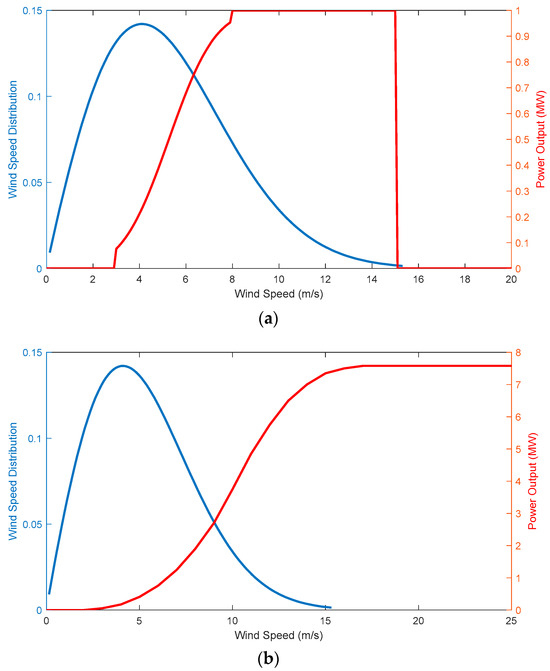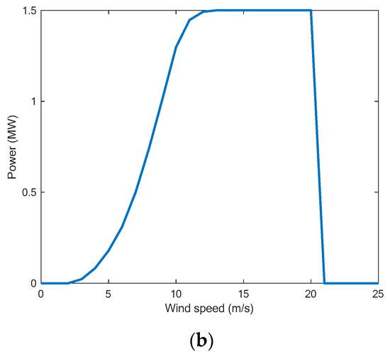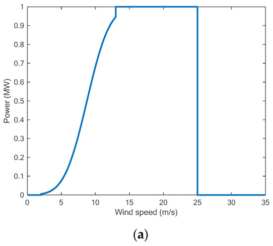 Figure 4a shows an illustration of a power curve for a WT that has the following characteristics: , , , and . It can be observed from Figure 4b that below the cut-in speed, there is no output power because the WT does not operate due to small torque, which is not sufficient to rotate the blades. If the wind speed increases, the WT starts to generate power until it reaches the rated speed and power. However, if the speed increases above the cut-out speed, the WT is shut down for safety reasons and therefore there is no output power.