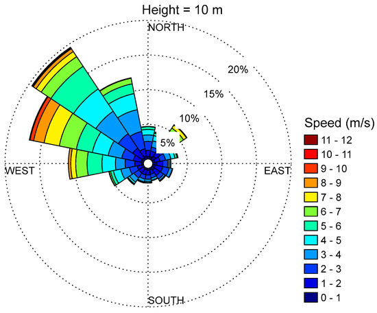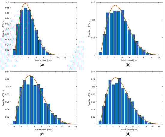 Two probability density functions given by Equations (1) and (2) are usually used to describe the wind speed distribution [31,36,37]. The first one, called the Rayleigh distribution, requires only the wind speed to calculate the probability density function, whilst the second one, called the Weibull distribution, requires two parameters, which are the shape parameter, referred to as and the scale parameter, referred to as . The Weibull probability density function is used in this study.