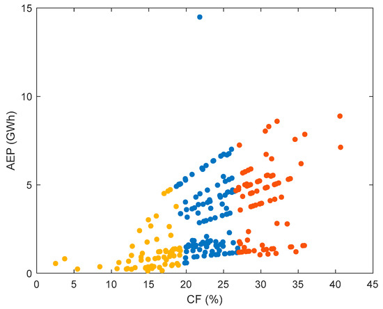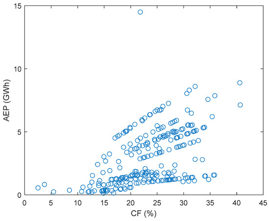 As reported in [32], the generally ranges between 20% and 40%, and obtaining a greater than 30% is the target. It is worth mentioning that a low value of may indicate that the WF project is not viable because the wind resources are not good or the WT is oversized.