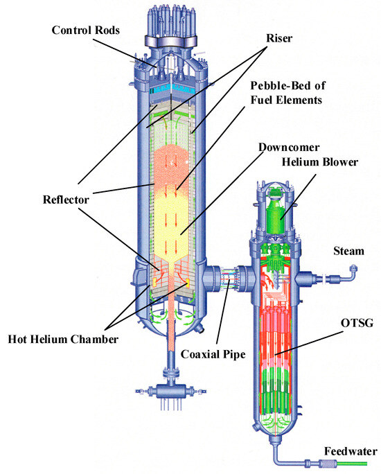 - Dong, Z.; Pan, Y.; Zhang, Z.; Dong, Y.; Huang, X. Dynamical Modeling and Simulation of the Six-Modular High Temperature Gas-Cooled Reactor Plant HTR-PM600. Energy 2018, 155, 971–991. [Google Scholar] [CrossRef]