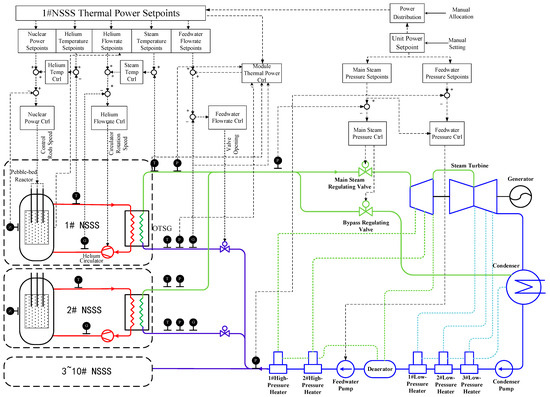 - Dong, Z.; Li, B.; Huang, X.; Dong, Y.; Zhang, Z. Power-Pressure Coordinated Control of Modular High Temperature Gas-Cooled Reactors. Energy 2022, 252, 124042. [Google Scholar] [CrossRef]